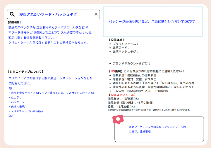 ネオマーケティングが管理・運営しているクリエイター登録プラットフォームに登録されているSNSクリエイターにコンテンツの制作とPR投稿を依頼します